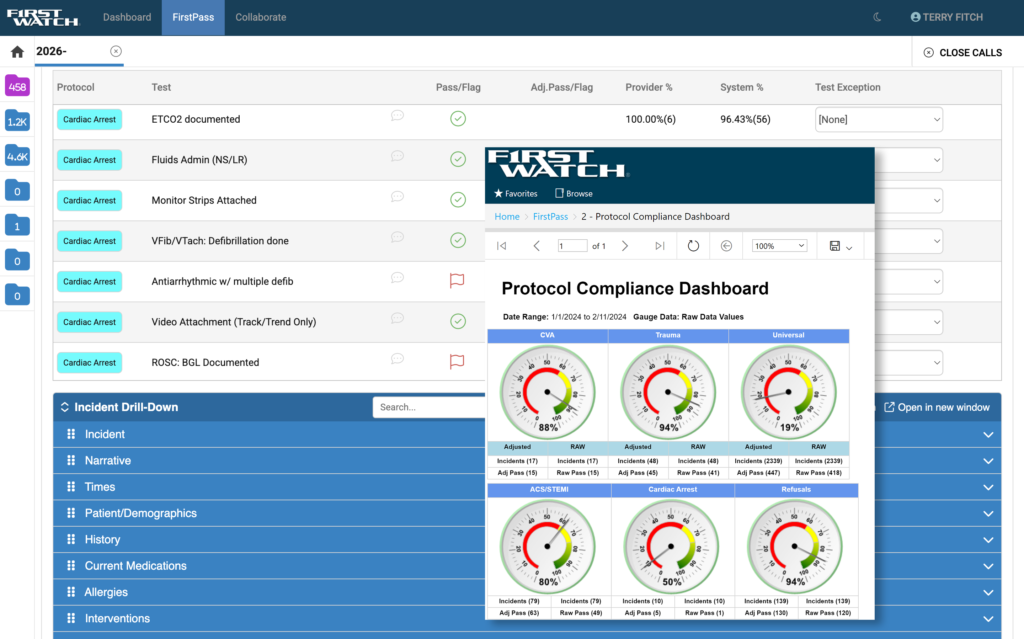 FirstPass is a clinical quality measurement and protocol monitoring tool designed to alert users to deviations in expected treatments to medical protocols. FirstPass provides continuous monitoring of ePCR and other data to quickly identify and provide real-time alerts related to protocol deviations, incomplete “care bundles” (which include scientifically validated patient care protocols), missing data elements or urgent patient safety issues. A standard bundle of protocols are designed to measure predefined quality metrics; protocols are configured with quality metrics, yet the agency has the ability to add metrics specific to their needs. The goal is not just quality improvement; it is the quality of care to the patient.